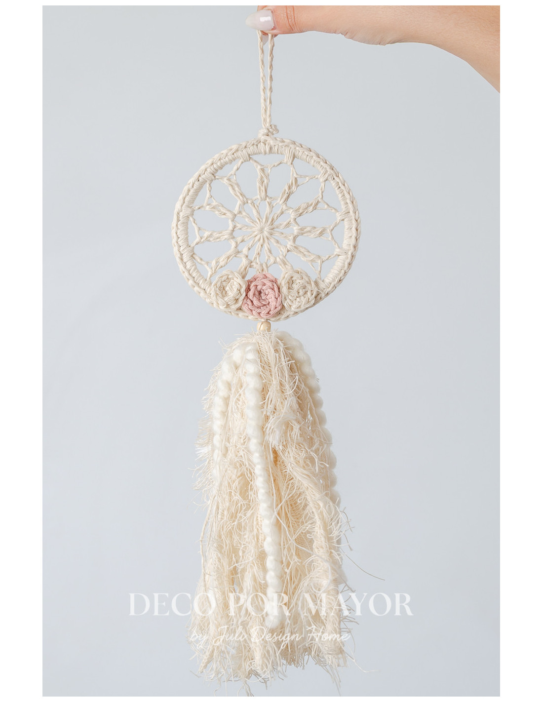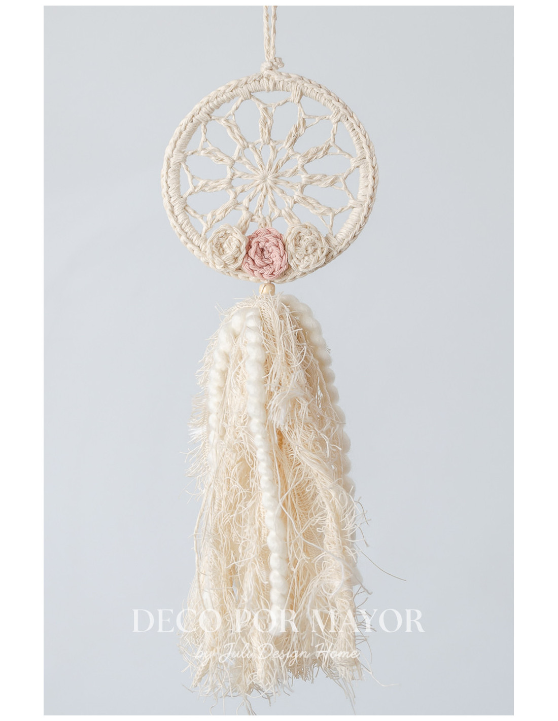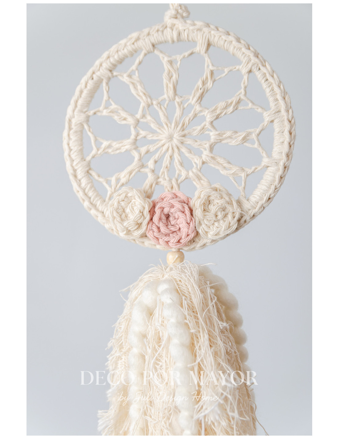 Atrapasueños tejido al crochet en tono rosa, natural y blanco.