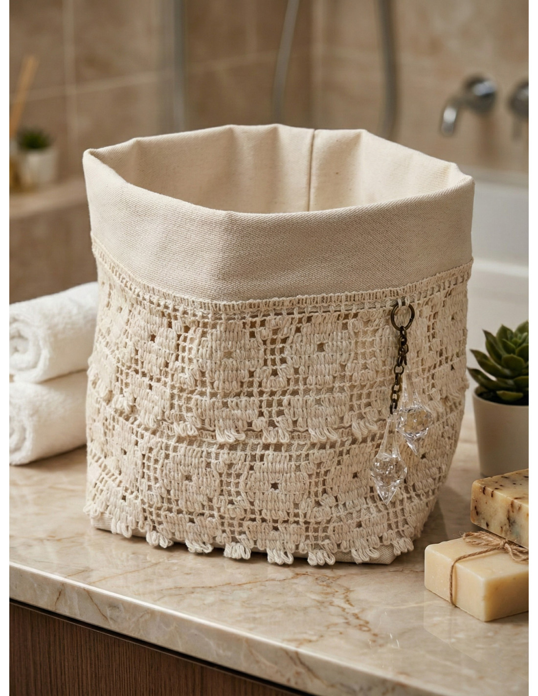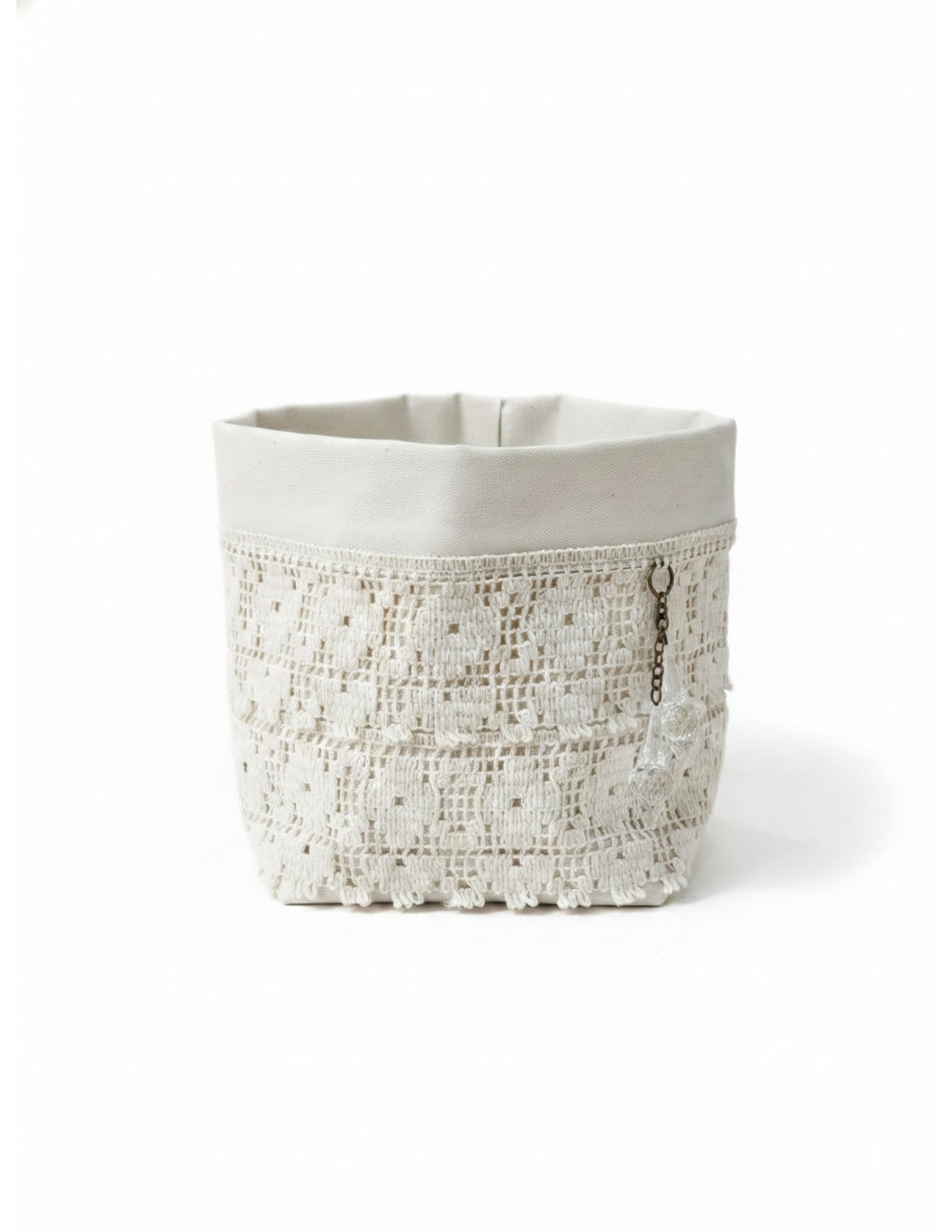 Organizador/Contenedor Clara de tela multiuso con puntilla y flecos.